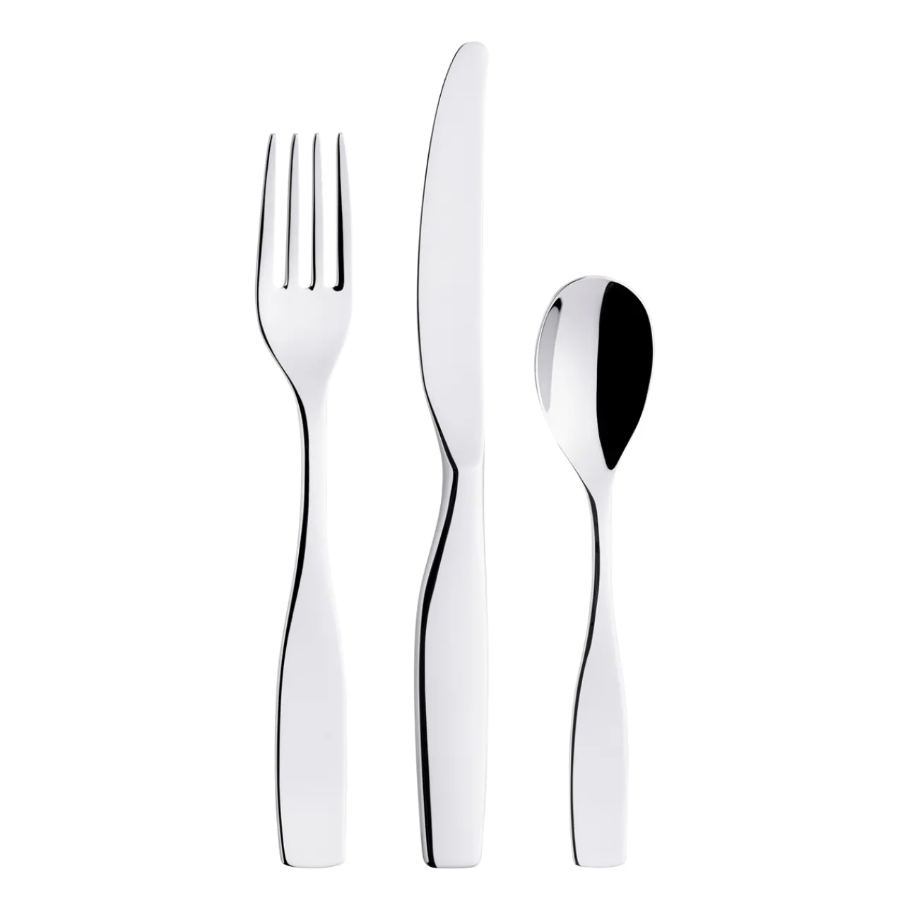 Dessertbesticken Citterio 98 är en raffinerad variant av vardagens nödvändigheter. Denna spegelpolerade utgåva är designad av Antonio Citterio och Glen Oliver Löw och består av medelstora skedar, gafflar och knivar – perfekt för förrätter, desserter, brunch eller mindre händer. Setet med 12 delar är tillverkat av 18/10 rostfritt stål och ger balans och elegans till alla dukningar.