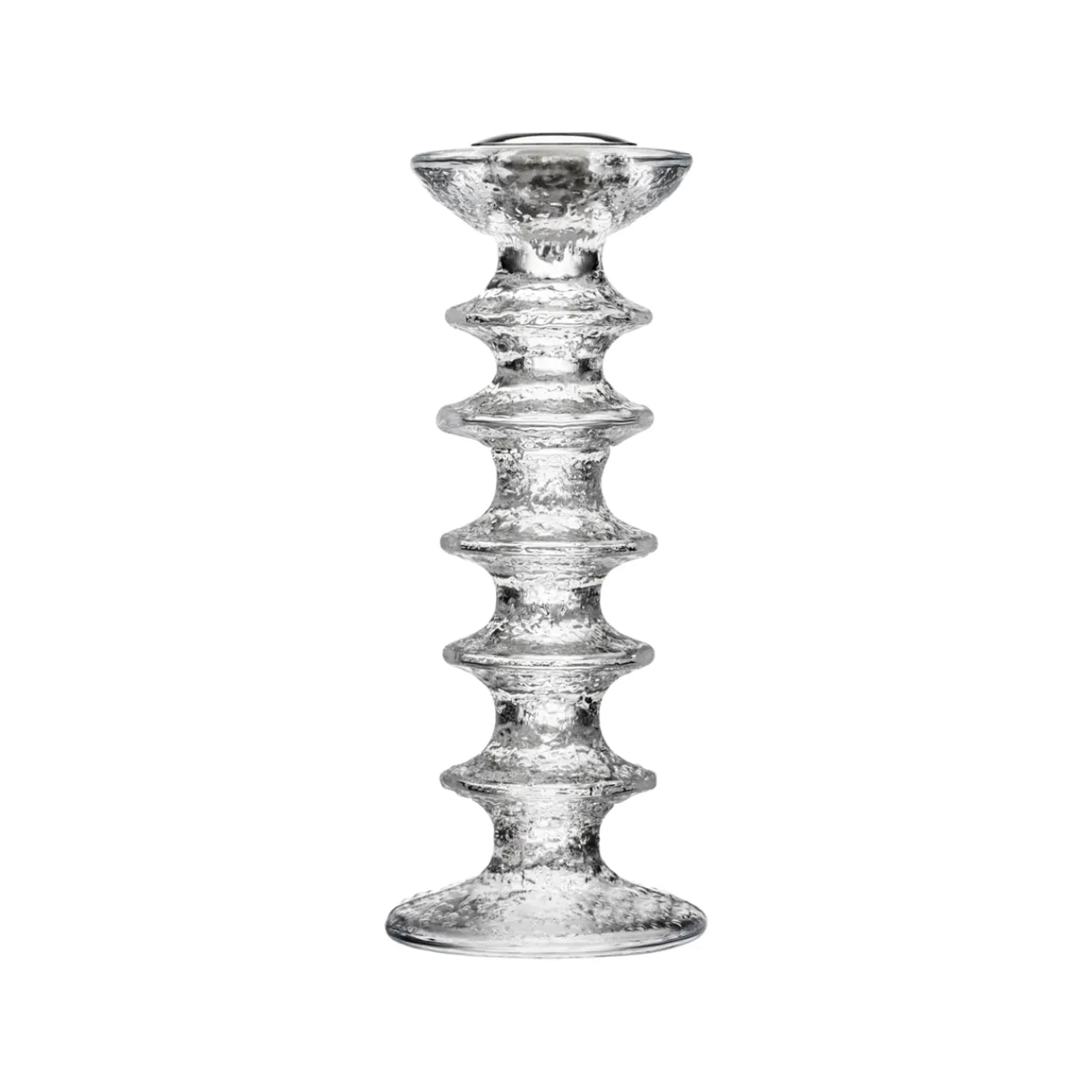 Designern Timo Sarpanevas ljusstake Festivo blev en omedelbar global sensation när den lanserades 1967. Den har sedan dess blivit en självklar del av modern finsk design. Glasytans grova isliknande struktur ger en elegant touch åt alla heminredningar. Ljusstakarna finns i flera olika storlekar och kan arrangeras i en elegant bordsdekoration bestående av en eller flera ljusstakar. Insatsen av metall ser till att ljuset sitter ordentligt på plats så att du kan njuta av ljusets varma sken utan att behöva oroa dig för säkerheten. Den 215 mm höga Festivo-ljusstakens mjuka elegans ger ett effektfullt intryck i alla inredningsmiljöer. Skapar en mjuk stämning. En perfekt bröllops-, jubileums- eller födelsedagspresent. Passar endast för ljus med avsmalnande fot.